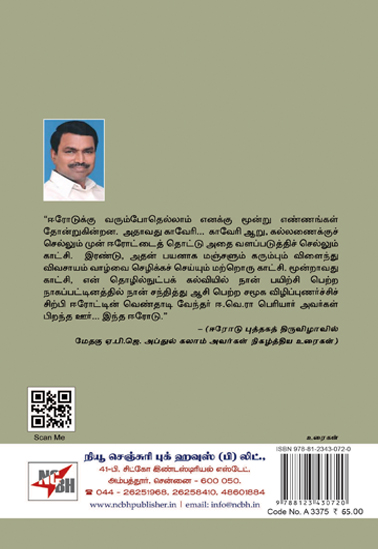 இரண்டு, அதன் பயனாக மஞ்சளும் கரும்பும் விளைந்து விவசாயம் வாழ்வை செழிக்கச் செய்யும் மற்றொரு காட்சி. மூன்றாவது காட்சி, என் தொழில்நுட்பக் கல்வியில் நான் பயிற்சி பெற்ற நாகப்பட்டினத்தில் நான் சந்தித்து ஆசி பெற்ற சமூக விழிப்புணர்ச்சிச் சிற்பி ஈரோட்டின் வெண்தாடி வேந்தர் ஈ.வெ.ரா பெரியார் அவர்கள் பிறந்த ஊர்… இந்த ஈரோடு.”
