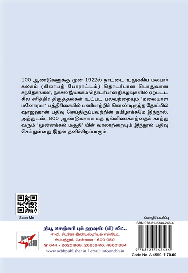 • 100 ஆண்டுகளுக்கு முன் 1922ல் நாட்டை உலுக்கிய மலபார் கலகம் (கிலாபத் போராட்டம்) தொடர்பான பொதுவான சந்தேகங்கள், நக்சல் இயக்கம் தொடர்பான நிகழ்வுகளில் ஏற்பட்ட சில சரித்திர திருத்தல்கள் உட்பட பலவற்றையும் ‘மலையாள மனோரமா’ பத்திரிகையில் பணியாற்றிக் கொண்டிருந்த தோப்பில் ஷாஜஹான் பதிவு செய்திருப்பவற்றின் தமிழாக்கமே இந்நூல்.