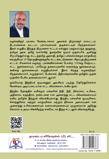 இந்திய தேசத்தில் வசிக்கும் மக்களின் நிதி, நீதி, நிர்வாகம், உரிமை, அதிகாரம், சுதந்திரம், தண்டனை என அனைத்து சட்ட விவரங்களையும் எளிய தமிழில் இந்நூல் விளக்கியுள்ளது. இந்திய மக்களின் குடியுரிமை, சொத்துரிமை மற்றும் வாழ்வுரிமை மற்றும் நிர்வாக அமைப்புகள் என அனைத்து உரிமைகளையும் வரையறைகளையும் முழுமையாக அறிந்து கொள்ள உதவும் மிகச்சிறந்த கையேடாக இந்த சட்டநூல் விளங்குகிறது.