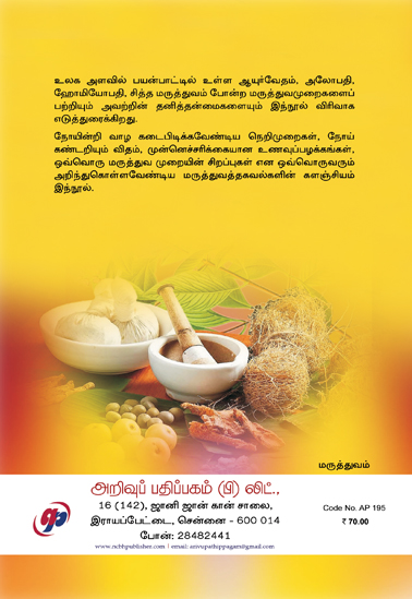 நோயின்றி வாழ கடைபிடிக்கவேண்டிய நெறிமுறைகள், நோய் கண்டறியும் விதம், முன்னெச்சரிக்கையான உணவுப்பழக்கங்கள். ஒவ்வொரு மருத்துவ முறையின் சிறப்புகள் என ஒவ்வொருவரும் அறிந்துகொள்ளவேண்டிய மருத்துவத்தகவல்களின் களஞ்சியம்.