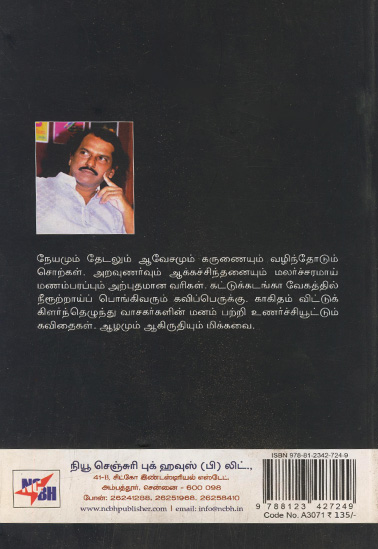 நேயமும் தேடலும் ஆவேசமும் கருணையும் வழிந்தோடும் சொற்கள். அறவுணர்வும் ஆக்கச்சிந்தனையும் மலர்ச்சரமாய் மணம்பரப்பும் அற்புதமான வரிகள், கட்டுக்கடங்கா வேகத்தில் நீரூற்றாய்ப் பொங்கிவரும் கவிப்பெருக்கு. காகிதம் விட்டுக் கிளர்ந்தெழுந்து வாசகர்களின் மனம் பற்றி உணர்ச்சியூட்டும் கவிதைகள். ஆழமும் ஆகிருதியும் மிக்கவை.