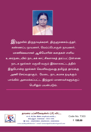 இந்நூலில் திருநாவுக்கரசர், திருஞானசம்பந்தர்,கண்ணப்ப நாயனார், மெய்ப்பொருள் நாயனார், மாணிக்கவாசகர் ஆகியோரின் கதைகள் எளிய உரைநடையில் நாடகக் காட்சிகளாகத் தரப்பட்டுள்ளன. நாடக நூல்கள் மருவி வரும் இக்காலகட்டத்தில் இதுபோன்ற நூல்கள் வெளிவருவது தமிழ்த் தாய்க்கு அணி செய்வதாகும். மேடை நாடகமாக நடிக்கும் பாங்கில் அமைக்கப்பட்ட இந்நூல் மாணவர்களுக்குப் பெரிதும் பயன்படும்.