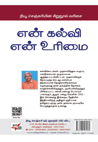 என் கல்வி என் உரிமை கல்விக்கூடங்கள், முதலாளித்துவ வகுப்பு மனநிலையால் முழுமையாக ஆழ்த்தப்பட்டுவிட்டன. முதலாளிக்குக் கீழ்ப்படிந்த கை ஆட்களையும் திறமையான தொழிலாளிகளையும் வழங்குவது தான் அவற்றின் நோக்கம், வாழ்க்கையிலிருந்தும், அரசியலிலிருந்தும் பிரிக்கப்பட்ட கல்வி என்பது பொய்யும் பாசாங்கும் ஆகும். என்று லெனின் 1918 – இல் சொன்னது இன்றைய தேதியில் இந்தியாவிற்கு அதிலும் குறிப்பாக, தமிழ்நாட்டிற்கு அச்சு அசலாக அப்படியே பொருந்துவதாக உள்ளது.