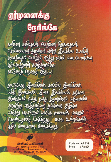 கனிவான கவிதைகள், செறிவான சிறுகதைகள், செம்மையான நாவல்கள் என்று இலக்கிய உலகின் கவனத்தைப் பெரிதும் ஈர்த்து வரும் படைப்பாளியான சூர்யகாந்தனின் கருத்தாழுமிக்க கட்டுரைத் தொகுதி இது…! ஏர் முனைக்கு நேரிங்கே