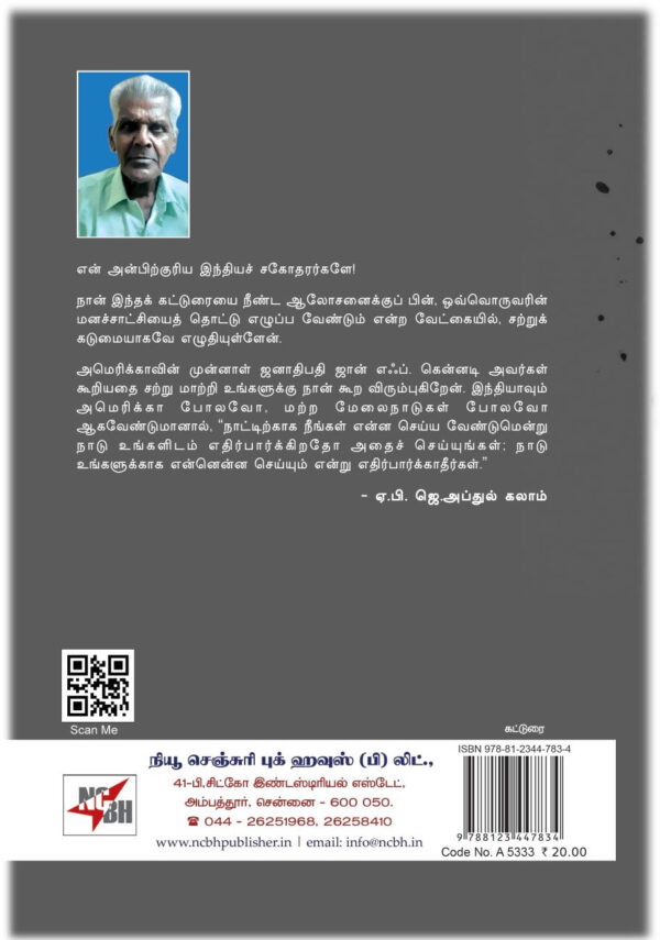 அமெரிக்காவின் முன்னாள் ஜனாதிபதி ஜான் எஃப். கென்னடி அவர்கள் கூறியதை சற்று மாற்றி உங்களுக்கு நான் கூற விரும்புகிறேன். இந்தியாவும் அமெரிக்கா போலவோ, மற்ற மேலைநாடுகள் போலவோ ஆகவேண்டுமானால், “நாட்டிற்காக நீங்கள் என்ன செய்ய வேண்டுமென்று நாடு உங்களிடம் எதிர்பார்க்கிறதோ அதைச் செய்யுங்கள்; நாடு உங்களுக்காக என்னென்ன செய்யும் என்று எதிர்பார்க்காதீர்கள்.”