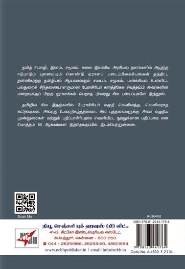 தமிழில் சில இதழ்களில் பேராசிரியர் எழுதி வெளிவந்த, வெளிவராத கட்டுரைகள், அவரது உரைநிகழ்த்தல்கள், சில புத்தகங்களுக்கு அவர் எழுதிய முன்னுரைகள் மற்றும் பதிப்பாசிரியராக வெளியிட்ட நூலுக்கான பதிப்புரை என மொத்தம் 18 ஆக்கங்கள் இத்தொகுப்பில் இடம்பெற்றுள்ளன.