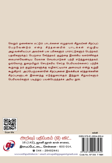 வெறும் ஓசைக்காக மட்டும் பாடல்களை எழுதாமல் சிறுவர்கள் சிறப்புப் பெறவேண்டும் என்ற சிந்தனையில் பாடல்கள் எழுதிய அழ.வள்ளியப்பா அவர்கள் பல பரிசுகளும் பாராட்டுகளும் பெற்றவர். பதவிகளுக்குப் பெருமை சேர்த்தவர். குழந்தை இலக்கிய வளர்ச்சிக்குக் கையாளவேண்டிய மேலான செயல்பாடுகள் பற்றி எடுத்துரைத்தவர். ஒவ்வொரு துறையிலும் செயற்கரிய செய்த பெரியவர்களைப் பற்றிக் கூறுவது நம் குழந்தைகளுக்கு வழிகாட்டியாக அமையும் என்று உறுதி கூறுகிறார். அப்பெருமகனாரின் சிறப்புகளை இலக்கியக் கர்த்தாக்களின் சிறப்புகளுடன் இணைத்து எடுத்துரைக்கும் இந்நூல் சிறுவர்களும் பெரியவர்களும் படித்துப் பயன்பெறத்தக்க அரிய நூல்.