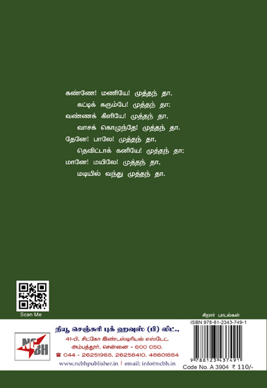 கண்ணே! மணியே! முத்தந் தா, கட்டிக் கரும்பே! முத்தந் தா; வண்ணக் கிளியே! முத்தந் தா, வாசக் கொழுந்தே! முத்தந் தா. தேனே! பாலே! மூத்தந் தா,தெவிட்டாக் கனியே! முத்தந் தா; மானே! மயிலே! மூத்தந் தா , மடியில் வந்து முத்தந் தா.