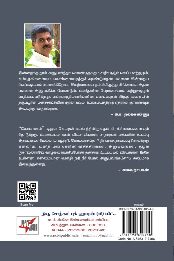 இன்றைக்கு நாம் அனுபவித்துக் கொண்டிருக்கும் அதிக சூடும் வெப்பமாற்றமும்| ஐம்பூதங்களையும் கொள்ளையடித்துச் சுரண்டுவதன் பலனை இன்றையு வெப்பசூட்டால் உணர்கிறோம். இயற்கையை நம்மிலிருந்து பிரிக்காமல் அதன் பலனை அனுபவிக்க வேண்டும். மனிதனின் பேராசையால் சுற்றுச்சூழல் பாதிக்கப்படுகிறது. சுப்ரபாரதிமணியனின் படைப்புகள் அந்த வகையில் திருப்பூரின் மனச்சாட்சியின் குரலாகவும், உலகமயத்திற்கு எதிரான குரலாகவும் அமைந்து வருகின்றன.