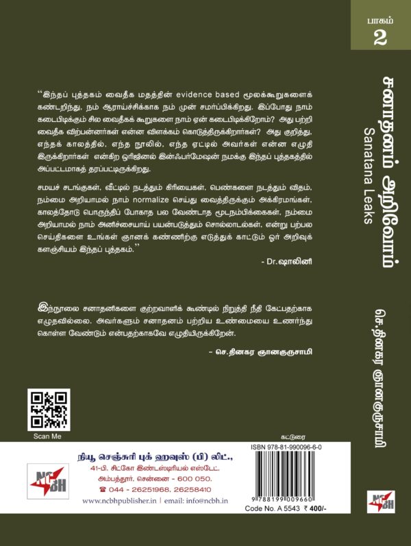| Book Name: Sanatana Leaks – 2 Regional Name: சனாதனம் அறிவோம் இரண்டாம் பாகம் Author: செ.தினகர ஞானகுருசாமி Edition: 1st Edition ISBN: 978-81-990096-6-0 Category: Essays Binding: Paper Binding Language: Tamil Publishing Year: 2025 Pages: 504 Code No: A5543 |
