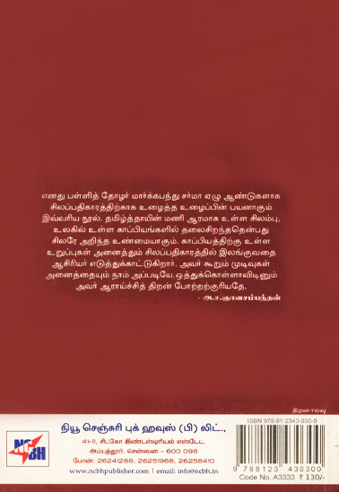 எனது பள்ளித் தோழர் மார்க்கபந்து சர்மா ஏழு ஆண்டுகளாக சிலப்பதிகாரத்திற்காக உழைத்த உழைப்பின் பயனாகும் இவ்வரிய நூல். தமிழ்த்தாயின் மணி ஆரமாக உள்ள சிலம்பு, உலகில் உள்ள காப்பியங்களில் தலைசிறந்ததென்பது சிலரே அறிந்த உண்மையாகும். காப்பியத்திற்கு உள்ள உறுப்புகள் அனைத்தும் சிலப்பதிகாரத்தில் இலங்குவதை ஆசிரியர் எடுத்துக்காட்டுகிறார். அவர் கூறும் முடிவுகள் அனைத்தையும் நாம் அப்படியே ஒத்துக்கொள்ளாவிடினும் அவர் ஆராய்ச்சித் திறன் போற்றற்குரியதே.