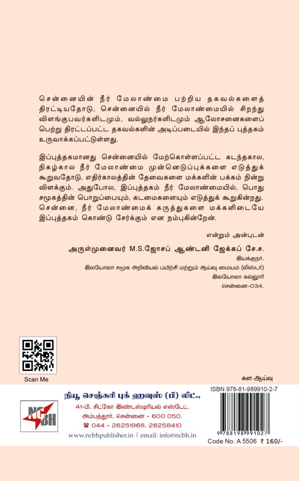 இப்புத்தகமானது சென்னையில் மேற்கொள்ளப்பட்ட கடந்தகால, நிகழ்கால நீர் மேலாண்மை முன்னெடுப்புக்களை எடுத்துக் கூறுவதோடு, எதிர்காலத்தின் தேவைகளை மக்களின் பக்கம் நின்று விளக்கும். அதுபோல, இப்புத்தகம் நீர் மேலாண்மையில், பொது 9 சமூகத்தின் பொறுப்பையும், கடமைகளையும் எடுத்துக் கூறுகின்றது. சென்னை, நீர் மேலாண்மைக் கருத்துகளை மக்களிடையே இப்புத்தகம் கொண்டு சேர்க்கும் என நம்புகின்றேன்.
