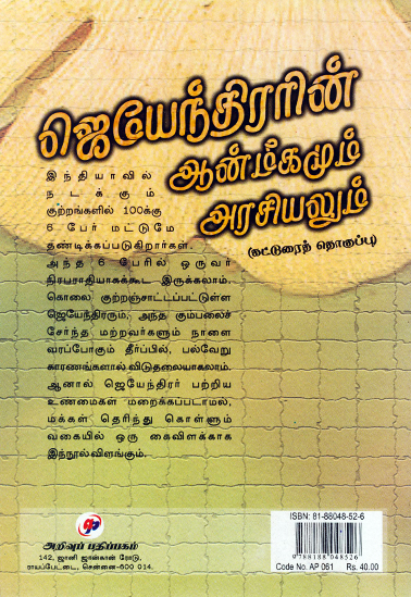 அந்த 6 பேரில் ஒருவர் நிரபராதியாகக்கூட இருக்கலாம். கொலை குற்றஞ்சாட்டப்பட்டுள்ள ஜெயேந்திரரும், அந்த கும்பலைச் சேர்ந்த மற்றவர்களும் நாளை வரப்போகும் தீர்ப்பில், பல்வேறு காரணங்களால் விடுதலையாகலாம். ஆனால் ஜெயேந்திரர் பற்றிய உண்மைகள் மறைக்கப்படாமல், மக்கள் தெரிந்து கொள்ளும் . வகையில் ஒரு கைவிளக்காக இந்நூல் விளங்கும்.
