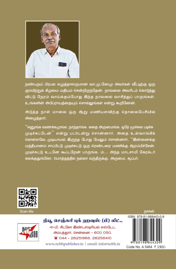 நண்பரும் பிரபல எழுத்தாளருமான வா.மு.கோமு அவர்கள் வீட்டிற்கு ஒரு ஞாயிற்றுக் கிழமை மதியம் சென்றிருந்தேன். நாவலை அவரிடம் கொடுத்து விட்டு நேரம் வாய்க்கும்போது இந்த நாவலை வாசித்துப் பாருங்கள். உங்களின் அபிப்ராயத்தையும் சொல்லுங்கள் என்று கூறினேன். அடுத்த நாள் மாலை ஒரு ஆறு மணியளவிற்கு தொலைபேசியில் அழைத்தார். “எனுங்க வணக்கமுங்க. நாந்தாங்க. கதை அருமைங்க. ஒரே மூச்சுல படிச்சு முடிச்சுட்டேன்” என்று பட்டென்று சொன்னார். அதை உள்வாங்கிக் கொள்ளவே முடியாமல் இருந்த போது மேலும் சொன்னார். “இன்னைக்கு மத்தியானம் சாப்பிட்டு முடிச்சுட்டு ஒரு ரெண்டரை மணிக்கு ஆரம்பிச்சேன். முடிச்சுட்டு உடனே கூப்டறேன் பாருங்க. ம்… அந்த மாடசாமி கேரக்டர் கலக்குதுங்கோ. மொத்தத்தில நல்லா வந்திருக்கு, அருமை. சூப்பர்.