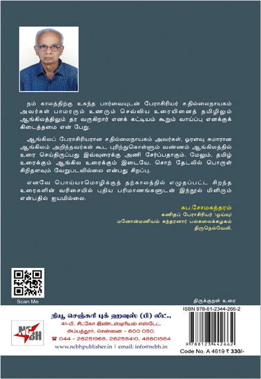 நம் காலத்திற்கு உகந்த பார்வையுடன் பேராசிரியர் ச.தில்லைநாயகம் அவர்கள் பாமரரும் உணரும் செவ்விய உரையினைத் தமிழிலும், ஆங்கிலத்திலும் தர வருகிறார் எனக் கட்டியம் கூறும் வாய்ப்பு எனக்குக் கிடைத்தமை என் பேறு.