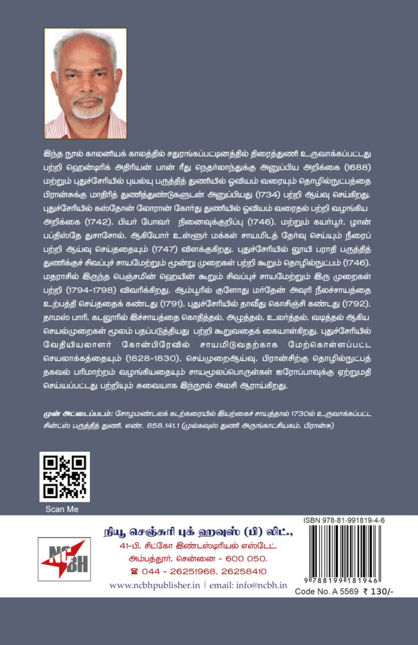 இந்த நூல் காலனியக் காலத்தில் சதுரங்கப்பட்டினத்தில் திரைத்துணி உருவாக்கப்பட்டது பற்றி ஹென்டிரிக் அதிரியன் பான் ரீது நெதர்லாந்துக்கு அனுப்பிய அறிக்கை (1688) மற்றும் புதுச்சேரியில் புயல்யு பருத்தித் துணியில் ஒவியம் வரையும் தொழில்நுட்பத்தை பிரான்சுக்கு மாதிரித் துணித்துண்டுகளுடன் அனுப்பியது (1734) பற்றி ஆய்வு செய்கிறது. புதுச்சேரியில் கஸ்தோன் லோரான் கோர்து துணியில் ஓவியம் வரைதல் பற்றி வழங்கிய அறிக்கை (1742). பியர் போவர் நினைவுக்குறிப்பு (1746), மற்றும் கயர்பூர். ழான் பப்திஸ்தே துசாசோல். ஆகியோர் உள்ளூர் மக்கள் சாயமிடத் தேர்வு செய்யும் நீரைப் பற்றி ஆய்வு செய்ததையும் (1747) விளக்குகிறது. புதுச்சேரியில் லூயி பராதி பருத்தித் துணிக்குச் சிவப்புச் சாயமேற்றும் மூன்று முறைகள் பற்றி கூறும் தொழில்நுட்பம் (1746). மதராசில் இருந்த பெஞ்சமின் ஹெயின் கூறும் சிவப்புச் சாயமேற்றும் இரு முறைகள் பற்றி (1794-1798) விவரிக்கிறது. ஆம்பூரில் குளோது மர்தேன் அவுரி நீலச்சாயத்தை உற்பத்தி செய்ததைக் கண்டது (1791), புதுச்சேரியில் தாவீது கொசிஞ்சி கண்டது (1792), தாமஸ் பாரி, கடலூரில் இச்சாயத்தை கொதித்தல், அழுத்தல், உலர்த்தல், வடித்தல் ஆகிய செயல்முறைகள் மூலம் பதப்படுத்தியது பற்றி கூறுவதைக் கையாள்கிறது. புதுச்சேரியில் வேதியியலாளர் கோன்பிரேவில் சாயமிடுவதற்காக மேற்கொள்ளப்பட்ட செயலாக்கத்தையும் (1828-1830), செய்முறைஆய்வு, பிரான்சிற்கு தொழில்நுட்பத் தகவல் பரிமாற்றம் வழங்கியதையும் சாயமூலப்பொருள்கள் ஐரோப்பாவுக்கு ஏற்றுமதி செய்யப்பட்டது பற்றியும் சுவையாக இந்நூல் அலசி ஆராய்கிறது. முன் அட்டைப்படம்: சோழமண்டலக் கடற்கரையில் இயற்கைச் சாயத்தால் 1730ல் உருவாக்கப்பட்ட சின்ட்ஸ் பருத்தித் துணி. எண். 858.141.1 (முல்கவுஸ் துணி அருங்காட்சியகம், பிரான்சு)