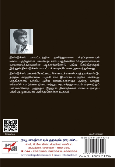 திண்டுக்கல் மாவட்டத்தின் தனித்துவமான சிறப்புகளையும் மாவட்டத்திலுள்ள பல்வேறு ஊர்ப்பகுதிகளின் பெருமையையும் வரலாற்றுத்தரவுகளின் ஆதாரங்களோடு பதிவு செய்திருக்கும் இந்நூல் திண்டுக்கல் மாவட்டக் களஞ்சியமாக அமைந்துள்ளது. திண்டுக்கல் மலைக்கோட்டை, கொடைக்கானல், வத்தலக்குண்டு, நத்தம், காந்திகிராமம், பழனி என இம்மாவட்டத்தின் பல்வேறு பகுதிகளைப் பற்றிய அரிய தகவல்களையும் அங்கு வாழும் மக்களின் வாழ்க்கை நிலை மற்றும் சமூகச்சூழலையும் வரலாற்றுப் பார்வையோடு அணுகும் இந்நூல் திண்டுக்கல் மாவட்டத்தைப் பற்றி முழுமையாக அறிந்துகொள்ள உதவும்.