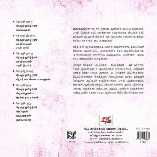 | Book Name: Thozhar Tamil Oli Aayvugal – Katturaigal – thanvaralaru Thoguthi Aaru Regional Name: தோழர் தமிழ்ஒளி ஆய்வுகள் – கட்டுரைகள் – தன்வரலாறு தொகுதி ஆறு Author: வீ.அரசு (பதிப்பாசிரியர்) Edition: 1st Edition ISBN: 978-81-985618-3-1 Category: Essays Binding: Paper Binding Language: Tamil Publishing Year: 2025 Pages: 480 Code No: A5390 |
