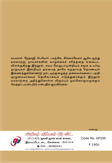காமராசர், நேதாஜி, பெரியார், பகத்சிங், சிங்காரவேலர் ஆகிய ஐந்து வரலாற்று நாயகர்களின் வாழ்க்கைச் சரிதத்தை சுவைபட விளக்குகிறது இந்நூல். சமய வேறுபாடின்றியும் சமூக உயர்வு தாழ்வுகள் இன்றியும் தம்மைத் தாமே சமுதாயத் தொண்டில் இணைத்துக்கொண்டு நாட்டிற்குழைத்த தலைவர்களைப் பற்றி முழுமையாகவும் தெளிவாகவும் எடுத்துரைக்கும் இந்நூல் வரலாற்றை அறிந்துகொள்ள விரும்பும் ஒவ்வொருவருக்கும் மெத்தப் பயன்படும் என்பதில் ஐயமில்லை.