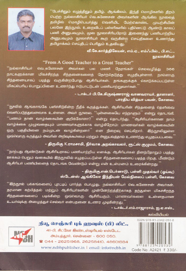 “நாற்பது ஆண்டுகள் ஆசிரியராகப் பணியாற்றிய எனக்கு ஆசிரியர்கள் தினந்தோறும் படித்து ஊக்கம் பெறும் வகையில் இந்நூலில் எழுதப்பட்டுள்ள சிந்தனைகளைப் படித்த பிறகு, மீண்டும் ஆசிரியர் பணியினைத் தொடங்க வேண்டும் என்று என் உள்மனம் உரைக்கின்றது.