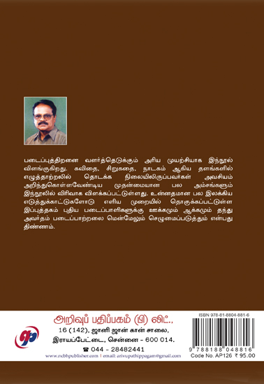 படைப்புத்திறனை வளர்த்தெடுக்கும் அரிய முயற்சியாக இந்நூல் விளங்குகிறது. கவிதை, சிறுகதை, நாடகம் ஆகிய தளங்களில் எழுத்தாற்றலில் தொடக்க நிலையிலிருப்பவர்கள் அவசியம் அறிந்துகொள்ளவேண்டிய முதன்மையான பல அம்சங்களும் இந்நூலில் விரிவாக விளக்கப்பட்டுள்ளது. உன்னதமான பல இலக்கிய எடுத்துக்காட்டுகளோடு எளிய முறையில் தொகுக்கப்பட்டுள்ள இப்புத்தகம் புதிய படைப்பாளிகளுக்கு ஊக்கமும் ஆக்கமும் தந்து அவர்தம் படைப்பாற்றலை மென்மேலும் செழுமைப்படுத்தும் என்பது திண்ணம்.