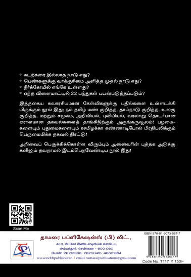 இத்தகைய சுவாரசியமான கேள்விகளுக்கு பதில்களை உள்ளடக்கி யிருக்கும் நூல் இது; நம் தமிழ் மண் குறித்த, தாய்நாடு குறித்த, உலகு குறித்த, மற்றும் சமூகம், அறிவியல், புவியியல், வரலாறு தொடர்பான ஏராளமான தகவல்களைத் தாங்கிநிற்கும் அருங்கருவூலம்! பழமை- களையும் புதுமைகளையும் ரசமிழக்கா கண்ணாடிபோல் பிரதிபலிக்கும் பெருமைமிக்க தகவல் திரட்டு!
