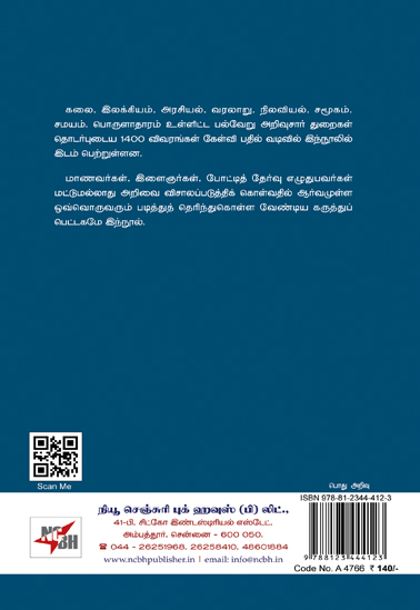 சமயம். பொருளாதாரம் உள்ளிட்ட பல்வேறு அறிவுசார் துறைகள் தொடர்புடைய 1400 விவரங்கள் கேள்வி பதில் வடிவில் இந்நூலில் இடம் பெற்றுள்ளன.