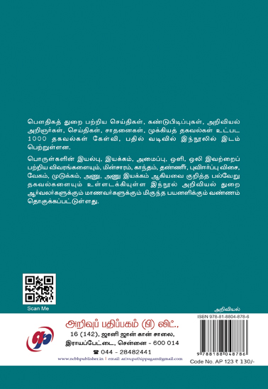 பொருள்களின் இயல்பு, இயக்கம், அமைப்பு, ஒளி, ஒலி இவற்றைப் பற்றிய விவரங்களையும், மின்சாரம், காந்தம், தண்ணீர், புவிஈர்ப்பு விசை, வேகம், முடுக்கம், அணு, அணு இயக்கம் ஆகியவை குறித்த பல்வேறு தகவல்களையும் உள்ளடக்கியுள்ள இந்நூல் அறிவியல் துறை ஆர்வலர்களுக்கும் மாணவர்களுக்கும் மிகுந்த பயனளிக்கும் வண்ணம் தொகுக்கப்பட்டுள்ளது.