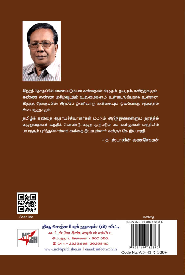 | Book Name : Manithargal Vaazhum Mannai Thedi Regional Name: மனிதர்கள் வாழும் மண்ணைத் தேடி…. Author : கே.ஜீவபாரதி Edition : 1st Edition ISBN : 978-81-987122-9-5 Category : Kavithai Binding : Paper Binding Language : Tamil Publishing Year: 2025 Pages : 96 Code No : A5543 |