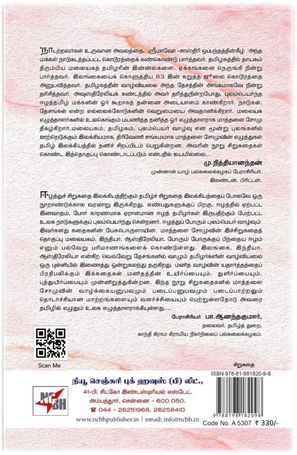 ஈழத்துச் சிறுகதை இலக்கியத்திற்கும் தமிழ்ச் சிறுகதை இலக்கியத்தைப் போலவே ஒரு நூறாண்டுக்கால வரலாறு இருக்கிறது. எண்பதுகளுக்குப் பிறகு, ஈழத்தில் ஏற்பட்ட இனவாதம், போர் காரணமாக ஏராளமான ஈழத் தமிழர்கள் இருபதிற்கும் மேற்பட்ட உலக நாடுகளுக்குப் புலம்பெயர்ந்து சென்றனர். ஈழத்துப் போரும் புலம்பெயர் வாழ்வும் இவர்களது கதைகளின் பேசுபொருளாயின. மாத்தளை சோமுவின் இச்சிறுகதைத் தொகுப்பு மலையகம், இந்தியா, ஆஸ்திரேலியா போரும் போருக்குப் பிந்தைய ஈழம் எனும் பல்வேறு பரிமாணங்களைக் கொண்டுள்ளது. இலங்கை, இந்தியா, ஆஸ்திரேலியா என்கிற வெவ்வேறு தேசங்களில் வாழும் தமிழர்களின் வாழ்வியலை ஒரு புள்ளியில் இணைத்து ஒன்றுகலந்து தருகிறது. மனித வாழ்வின் யதார்த்தத்தைப் பிரதிபலிக்கும் இக்கதைகள் மனிதத்தின் உயிர்ப்பையும், துளிர்ப்பையும். புத்துயிர்ப்பையும் முன்னிறுத்துகின்றன. இந்த நூறு சிறுகதைகளில் மாத்தளை சோமுவின் வாழ்க்கையனுபவமும் படைப்பனுபவமும் படைப்பாற்றலும் தொடர்ச்சியான மாற்றங்களையும் வளர்ச்சியையும் பெற்றுள்ளதோடு அவரை தமிழில் எழுதும் உலக எழுத்தாளராக்கியுள்ளது….