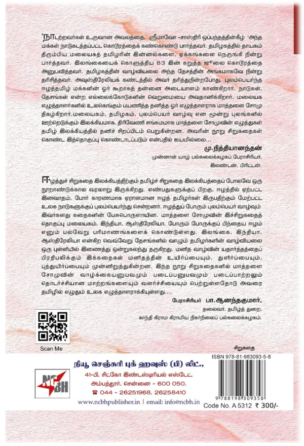 ஈழத்துச் சிறுகதை இலக்கியத்திற்கும் தமிழ்ச் சிறுகதை இலக்கியத்தைப் போலவே ஒரு நூறாண்டுக்கால வரலாறு இருக்கிறது. எண்பதுகளுக்குப் பிறகு. ஈழத்தில் ஏற்பட்ட இனவாதம், போர் காரணமாக ஏராளமான ஈழத் தமிழர்கள் இருபதிற்கும் மேற்பட்ட உலக நாடுகளுக்குப் புலம்பெயர்ந்து சென்றனர். ஈழத்துப் போரும் புலம்பெயர் வாழ்வும். இவர்களது கதைகளின் பேசுபொருளாயின. மாத்தளை சோமுவின் இச்சிறுகதைத் தொகுப்பு மலையகம், இந்தியா, ஆஸ்திரேலியா, போரும் போருக்குப் பிந்தைய ஈழம் எனும் பல்வேறு பரிமாணங்களைக் கொண்டுள்ளது. இலங்கை, இந்தியா. ஆஸ்திரேலியா என்கிற வெவ்வேறு தேசங்களில் வாழும் தமிழர்களின் வாழ்வியலை ஒரு புள்ளியில் இணைத்து ஒன்றுகலந்து தருகிறது. மனித வாழ்வின் யதார்த்தத்தைப் பிரதிபலிக்கும் இக்கதைகள் மனிதத்தின் உயிர்ப்பையும், துளிர்ப்பையும், புத்துயிர்ப்பையும் முன்னிறுத்துகின்றன. இந்த நூறு சிறுகதைகளில் மாத்தளை சோமுவின் வாழ்க்கையனுபவமும் படைப்பனுபவமும் படைப்பாற்றலும் தொடர்ச்சியான மாற்றங்களையும் வளர்ச்சியையும் பெற்றுள்ளதோடு அவரை தமிழில் எழுதும் உலக எழுத்தாளராக்கியுள்ளது….