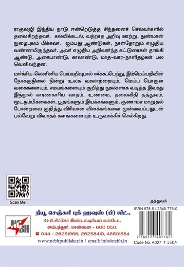 மார்க்சிய-லெனினிய மெய்யறிவுபால் ஈர்க்கப்பெற்று, இம்மெய்யறிவின் நோக்குநிலை நின்று உலக வரலாற்றையும், மெய்ப் பொருள் வகைகளையும், சமயங்களையும் குறித்து நூல்களாக வடித்த இவரது இந்நூல் காரணகாரிய வாதம், உண்மை, தலைவிதி தத்துவம், மூடநம்பிக்கைகள், பூதங்களும் இயக்கங்களும், குணாம்ச மாறுதல் போன்றவை குறித்து விரிவான விளக்கங்களை முன்வைப்பதுடன் பல்வேறு விவாதக் களங்களையும் உருவாக்கிச் செல்கிறது.