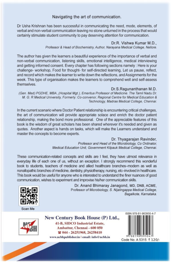 In the current scenario where Doctor Patient relationship is encountering critical challenges, the art of communication will provide appropriate solace and enrich the doctor patient relationship, making the bond more professional. One of the appreciable features of this book is the wisdom of great scholars has been shared wherever it’s needed and given as quotes. Another aspect is hands on tasks, which will make the Learners understand and master the concepts to become experts.